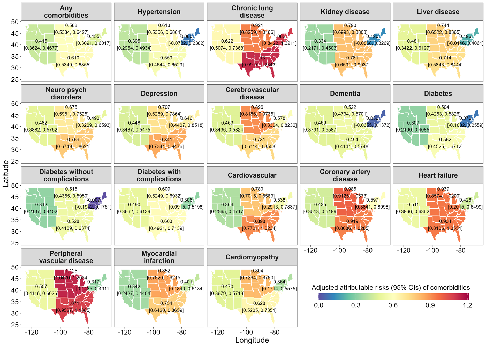 We designed a retrospective cohort study examining LC development using the National COVID Cohort Collaborative (N3C) database (N = 5,707,643) between 2020 and 2024, along with County Health Rankings and Roadmaps, the Social Vulnerability Index, and Rural–Urban Continuum Codes data sources. Employing counterfactual estimation methods based on double/debiased machine learning, we compared the Adjusted Attributable Risks (aARs) and Relative Risks (aRRs) of 14 common comorbidities among different health disparities for LC.
